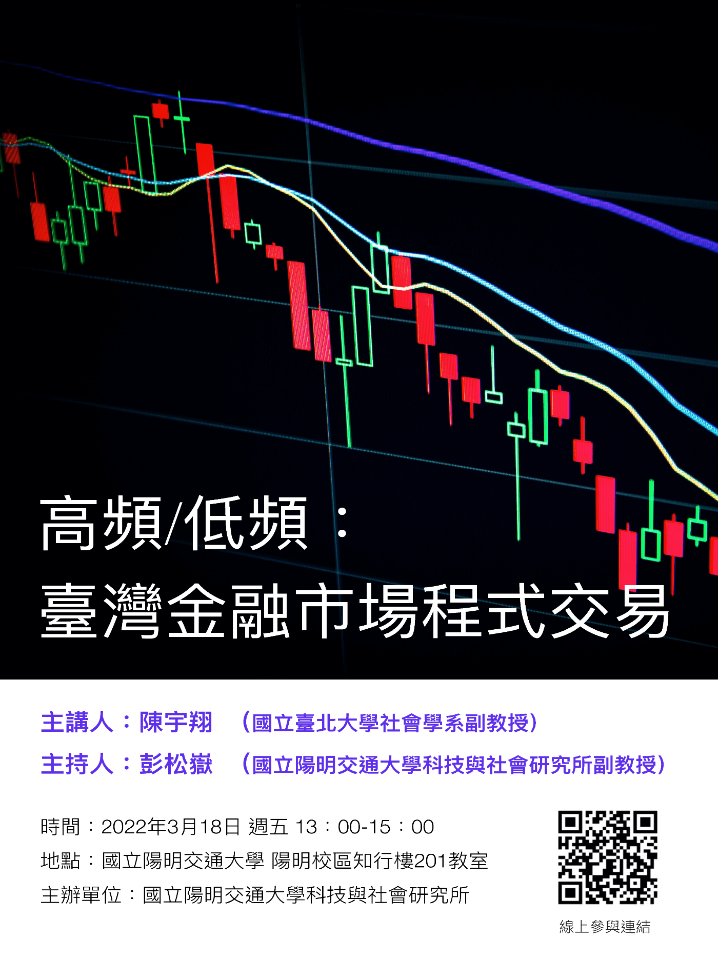 【學術演講】111.03.18(五)下午1:00 高頻/低頻:台灣金融市場程式交易 Posted on 2022-03-152025-01-10 by sts65072 講 題:高頻/低頻:台灣金融市場程式交易 講 者:陳宇翔 副教授 (國立臺北大學社會學系) 主持人:彭松嶽 副教授 (國立陽明交通大學科技與社會研究所) 時 間:111年3月18日(五)下午1:00~3:00 地 點:國立陽明交通大學陽明校區知行樓2樓201教室 線上參與:https://meet.google.com/ajq-mjuv-ahk 附件 1110318高頻低頻:台灣金融市場程式交易海報_附件 (310 kB)