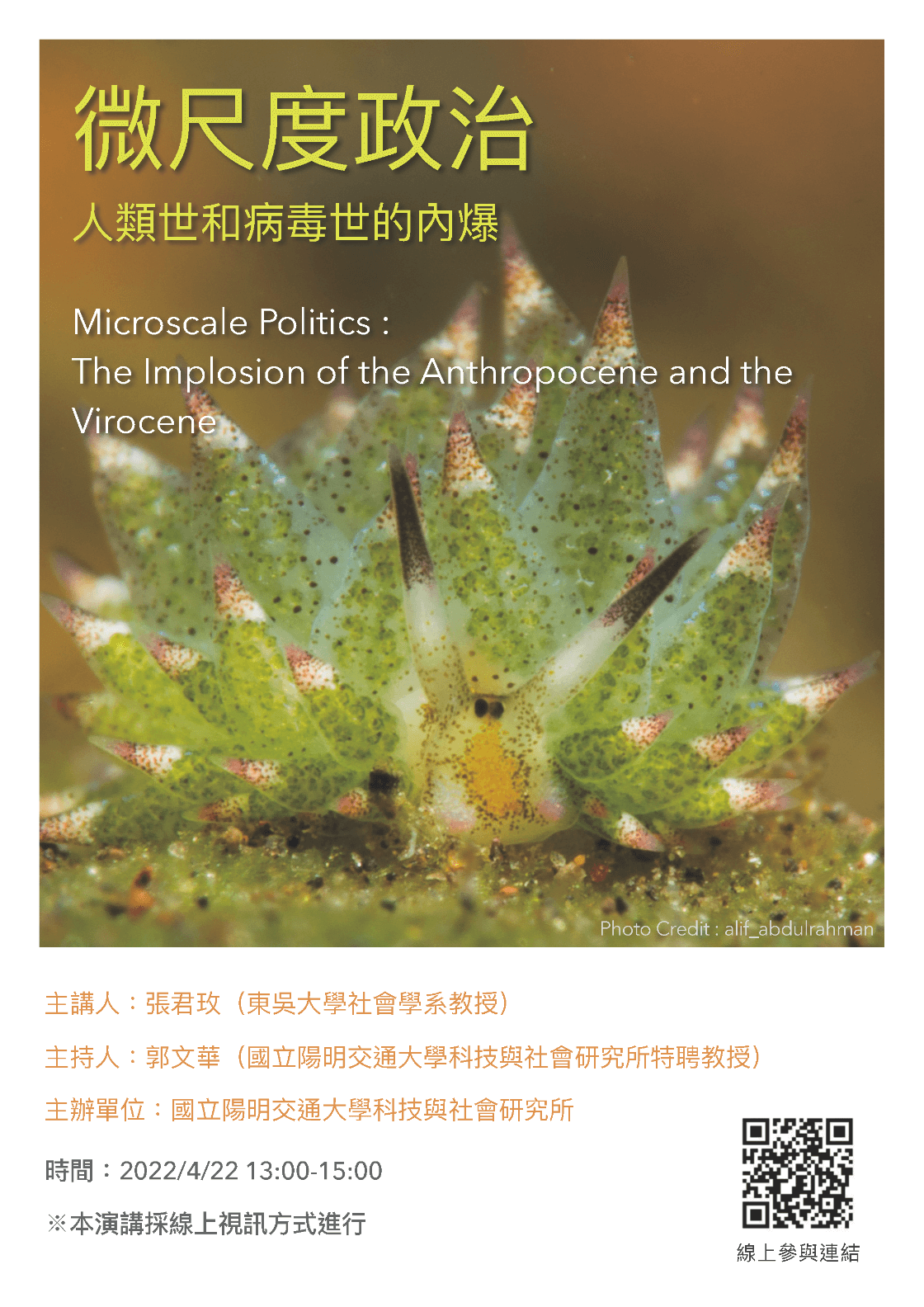 【學術演講】111.04.22(五)下午1:00 微尺度政治:人類世和病毒世的內爆 Posted on 2022-04-182025-01-10 by sts65072 講 題:微尺度政治:人類世和病毒世的內爆 講 者:張君玫 教授 (東吳大學社會學系) 主持人:郭文華 特聘教授 (國立陽明交通大學科技與社會研究所) 時 間:111年4月22日(五)下午1:00~3:00 線上參與:https://meet.google.com/ajq-mjuv-ahk 附件 1110422微尺度政治:人類世和病毒世的內爆海報_附件 (482 kB)
