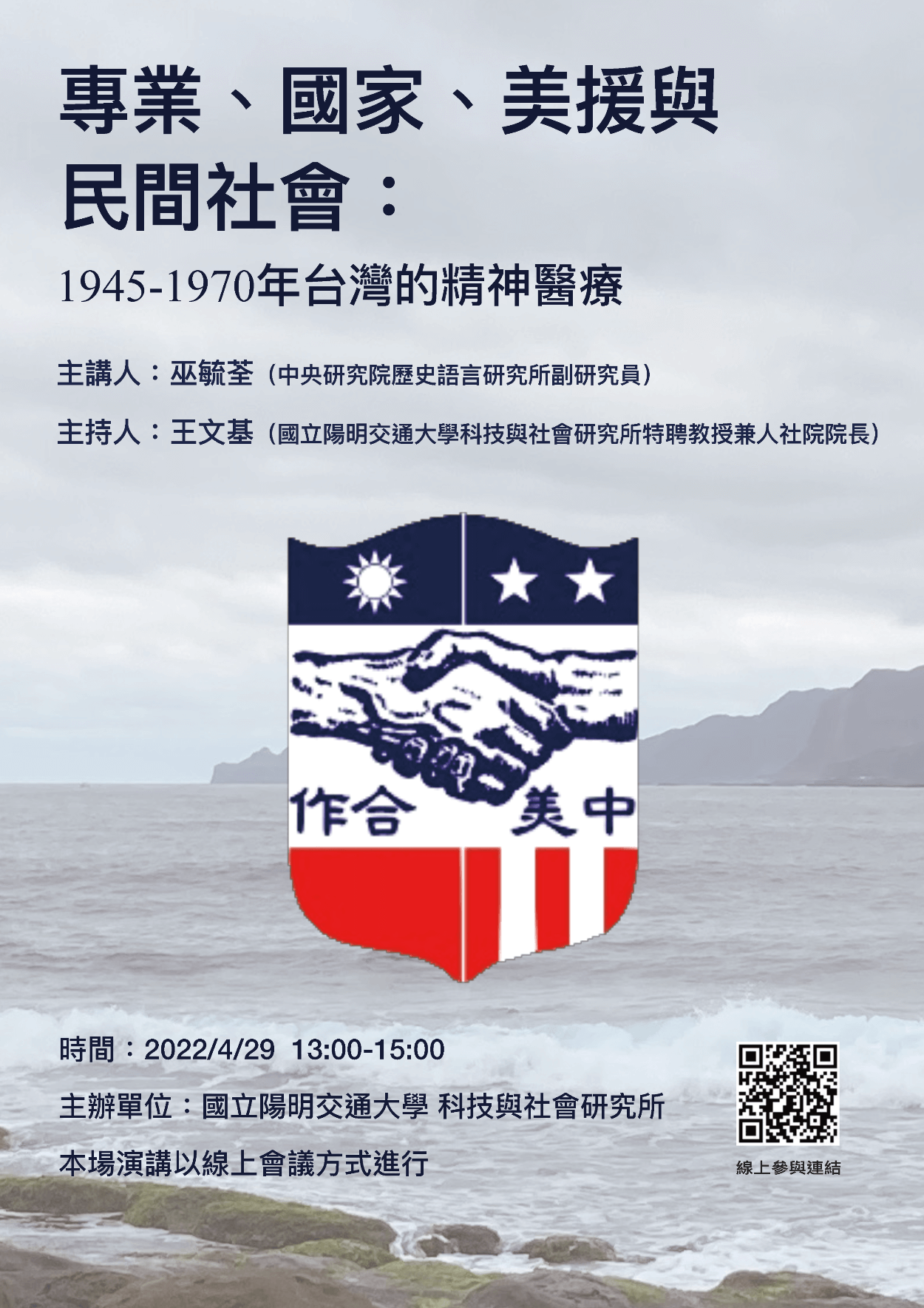 【學術演講】111.04.29(五)下午1:00 專業、國家、美援與民間社會:1945–1970年台灣的精神醫療 Posted on 2022-04-262025-01-10 by sts65072 講 題:專業、國家、美援與民間社會:1945–1970年台灣的精神醫療 講 者:巫毓荃 副研究員 (中央研究院歷史語言研究所) 主持人:王文基 特聘教授兼人社院院長 (國立陽明交通大學科技與社會研究所) 時 間:111年4月29日(五)下午1:00~3:00 線上參與:https://meet.google.com/ajq-mjuv-ahk 附件 1110429專業、國家、美援與民間社會:1945–1970年台灣的精神醫療海報_附件 (549 kB)