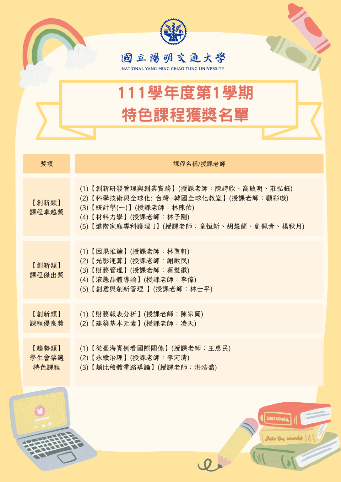 【賀】本所顧彩璇老師獲111學年度第1學期特色課程獎 Posted on 2023-09-252024-10-25 by sts65072 恭喜本所顧彩璇老師於111學年度第1學期開設之大學部課程:「科學技術與全球化:台灣–韓國全球化教室」,獲特色課程之【創新類】課程卓越獎。 獲獎名單提供:本校教務處教師發展中心。 附件 111學年度第1學期特色課程獲獎名單 (181 kB)