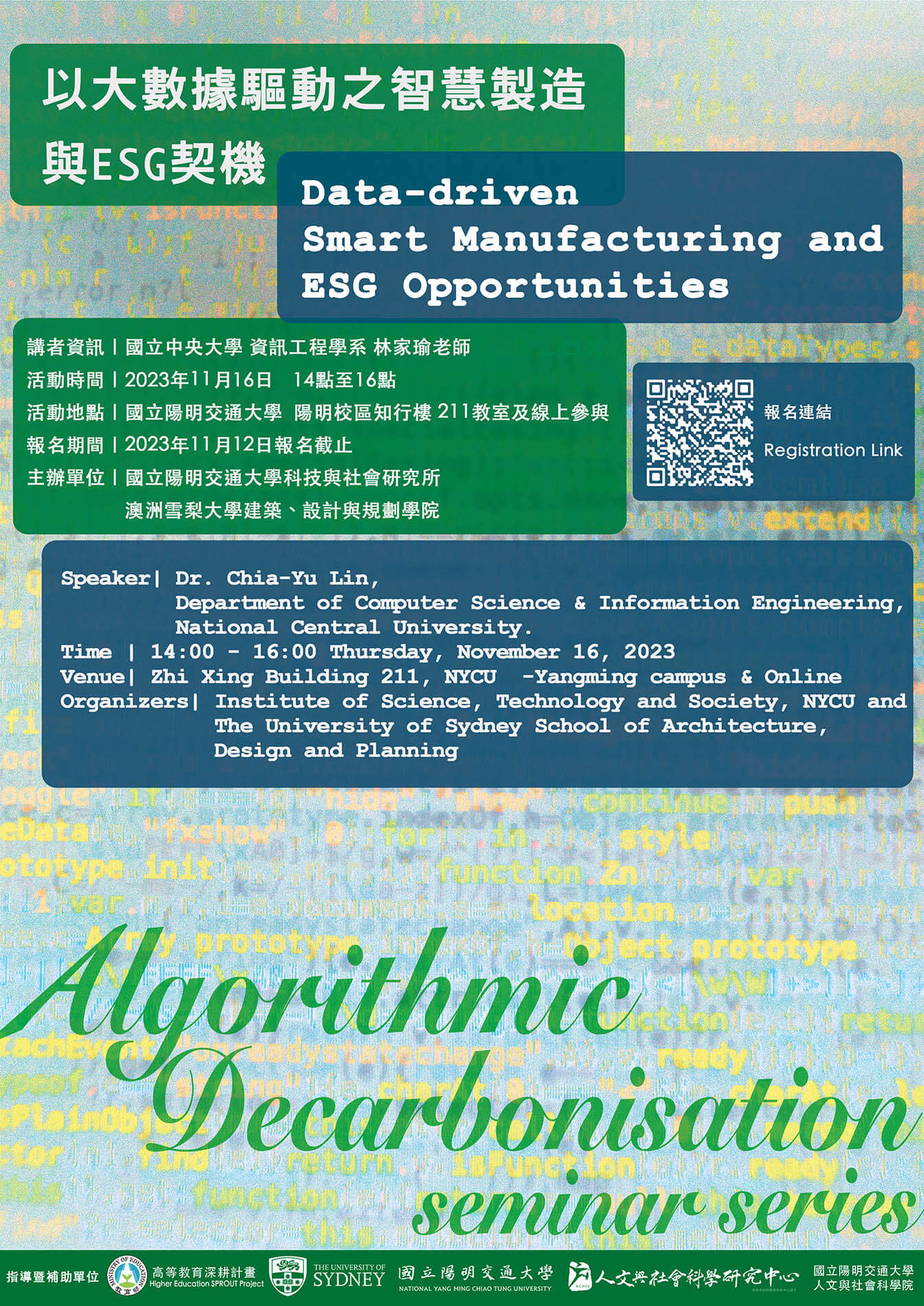 Globally, decarbonisation policies and strategies include the development and deployment of intelligent technologies, as well as highlighting the importance of actively addressing issues concerning just transitions. In light of this, the algorithmic decarbonisation seminar series begins by inviting Taiwanese scholars to share their research and views on the current situations and future visions of using intelligent technologies for carbon reduction. In doing so, it hopes to inspire more reflections and discussions on the social implications of deploying algorithms for decarbonisation. We also plan to invite Australian and Japanese scholars to share their work for understanding the present and future of decarbonisation and net zero transitions in different environmental, social, industrial and policy contexts.
