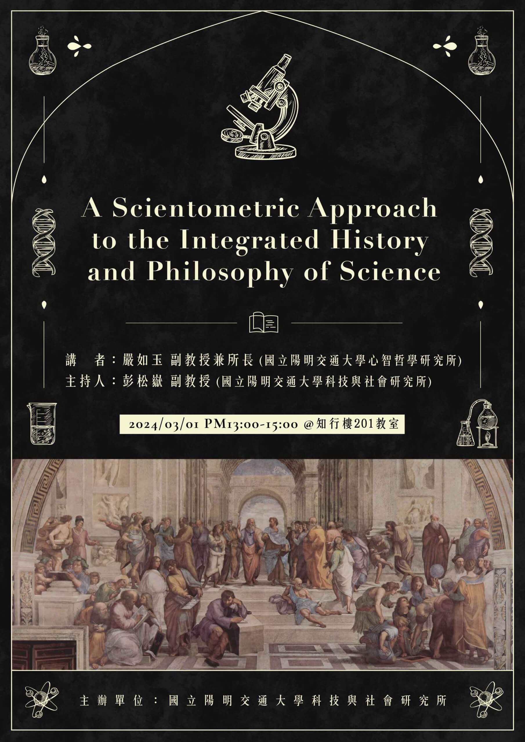 113.03.01(五)下午1:00 A Scientometric Approach to the Integrated History and Philosophy of Science Posted on 2024-02-152025-01-10 by sts65072 講 題:A Scientometric Approach to the Integrated History and Philosophy of Science 講 者:嚴如玉 副教授兼所長 (國立陽明交通大學心智哲學研究所) 主持人:彭松嶽 副教授 (國立陽明交通大學科技與社會研究所) 時 間:113年3月1日(五)下午1:00~3:00 地 點:國立陽明交通大學(陽明校區)知行樓2樓201教室 附件 1130301A Scientometric Approach to the Integrated History and Philosophy of Science海報_附件 (319 kB)