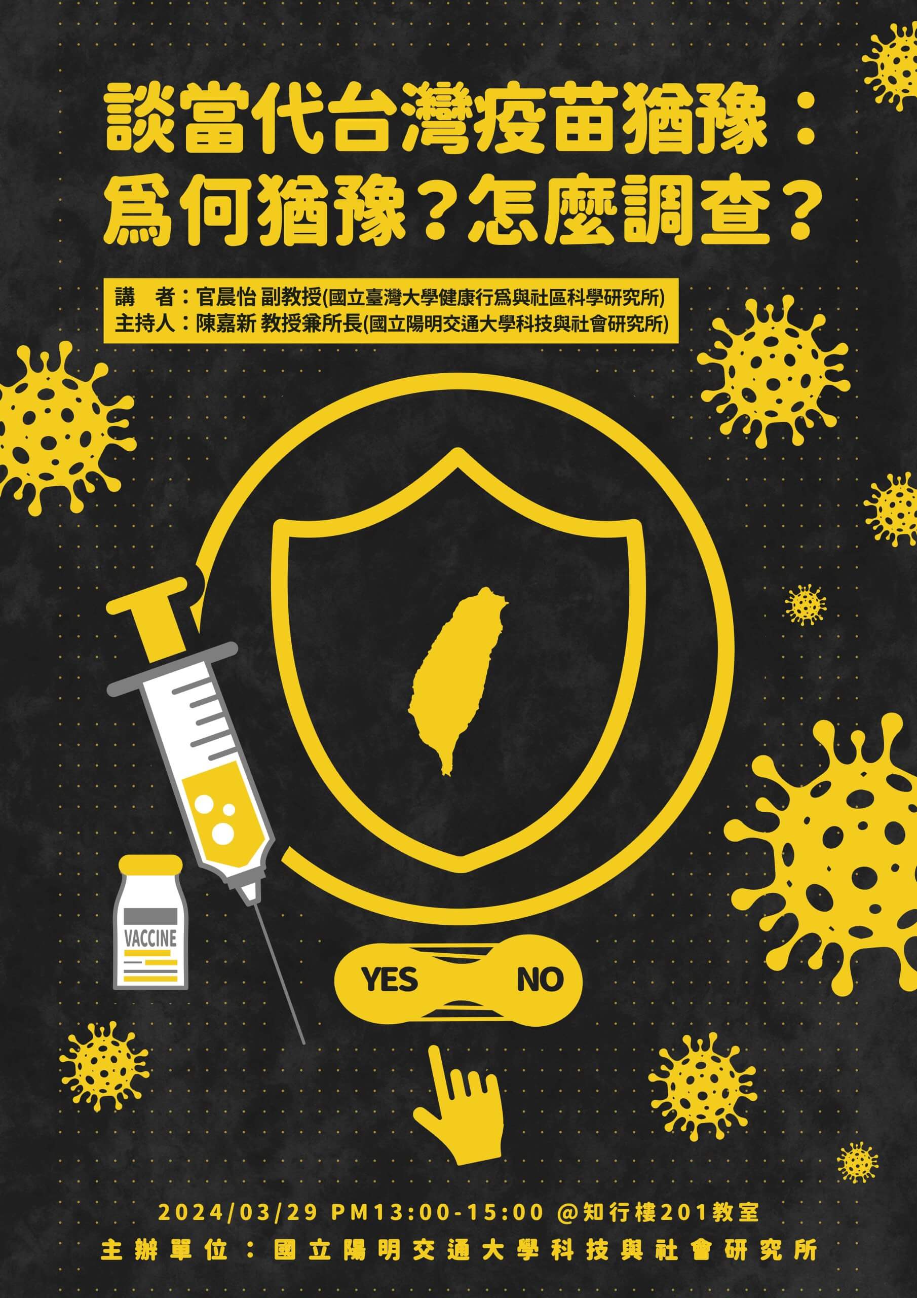 113.03.29(五)下午1:00 談當代台灣疫苗猶豫:為何猶豫?怎麼調查? Posted on 2024-03-052025-07-24 by sts65072 講 題:談當代台灣疫苗猶豫:為何猶豫?怎麼調查? 講 者:官晨怡 副教授 (國立臺灣大學健康行為與社區科學研究所) 主持人:陳嘉新 教授兼所長 (國立陽明交通大學科技與社會研究所) 時 間:113年3月29日(五)下午1:00~3:00 地 點:國立陽明交通大學(陽明校區)知行樓2樓201教室 附件 1130329談當代台灣疫苗猶豫:為何猶豫?怎麼調查?海報_附件 (315 kB)