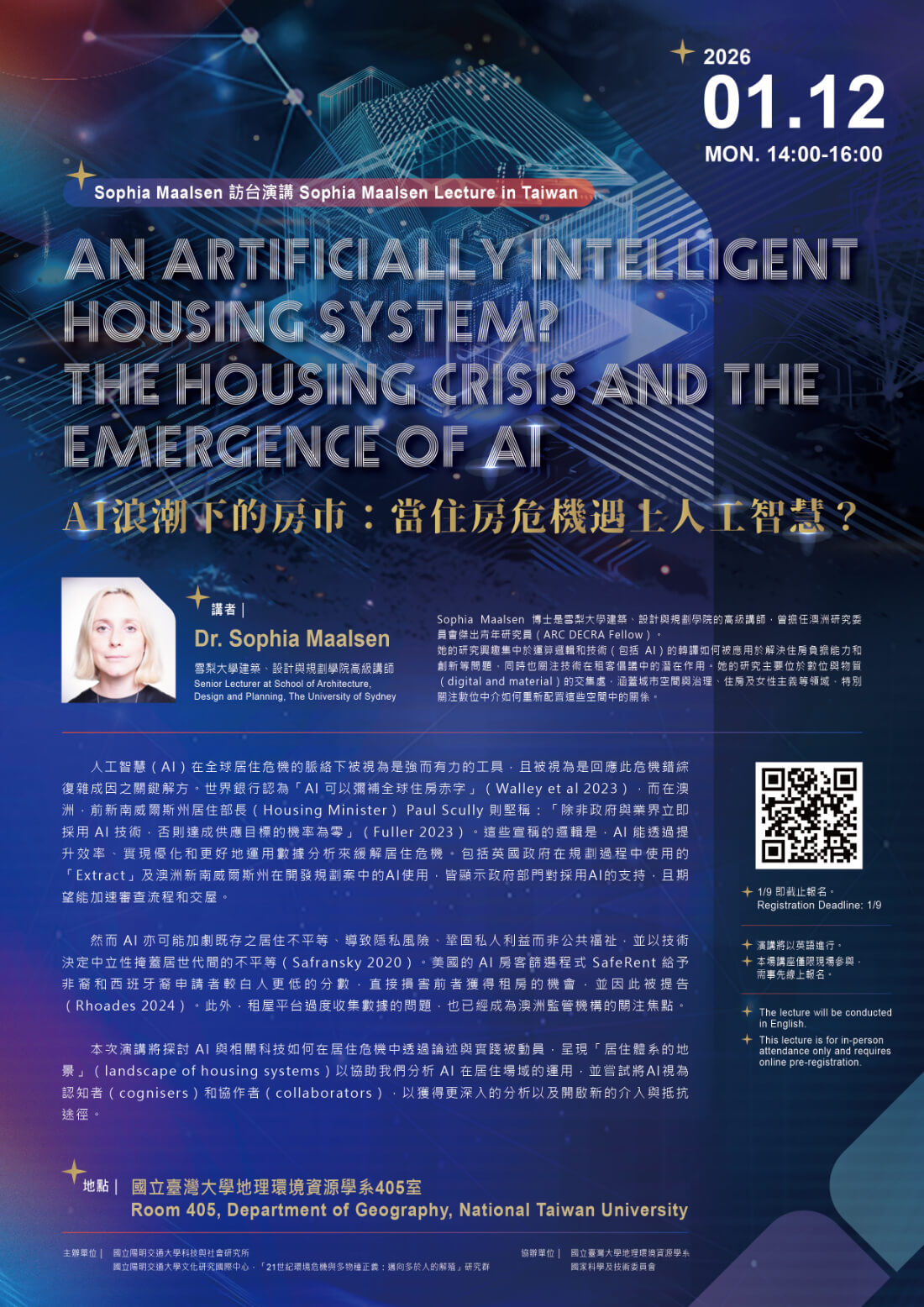 本次演講將探討 AI 與相關科技如何在居住危機中透過論述與實踐被動員,呈現「居住體系的地景」(landscape of housing systems)以協助我們分析 AI 在居住場域的運用,並嘗試將AI視為認知者(cognisers)和協作者(collaborators),以獲得更深入的分析以及開啟新的介入與抵抗途徑。
